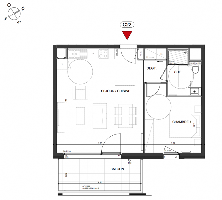375 000€ Appt. T2 51.8m2 0-RDC